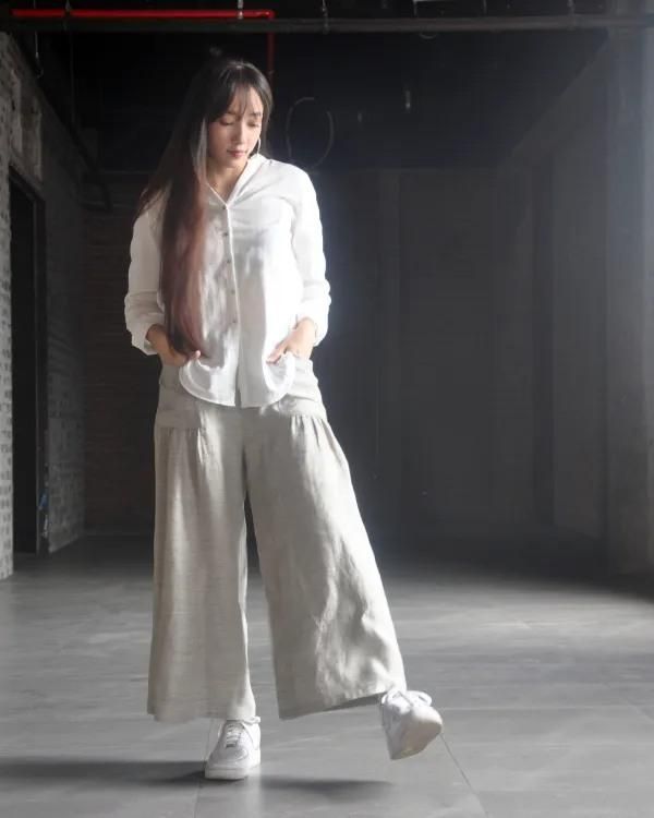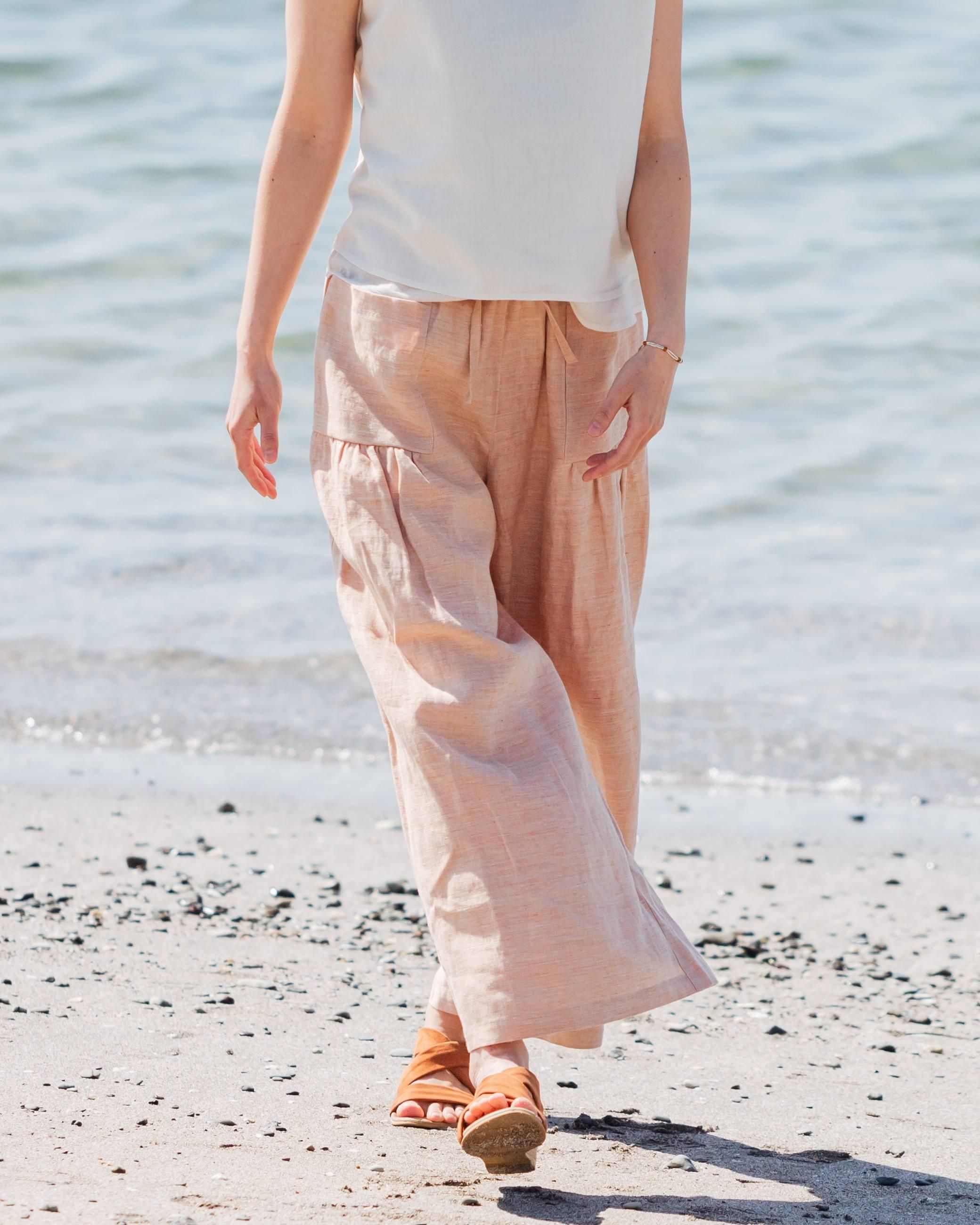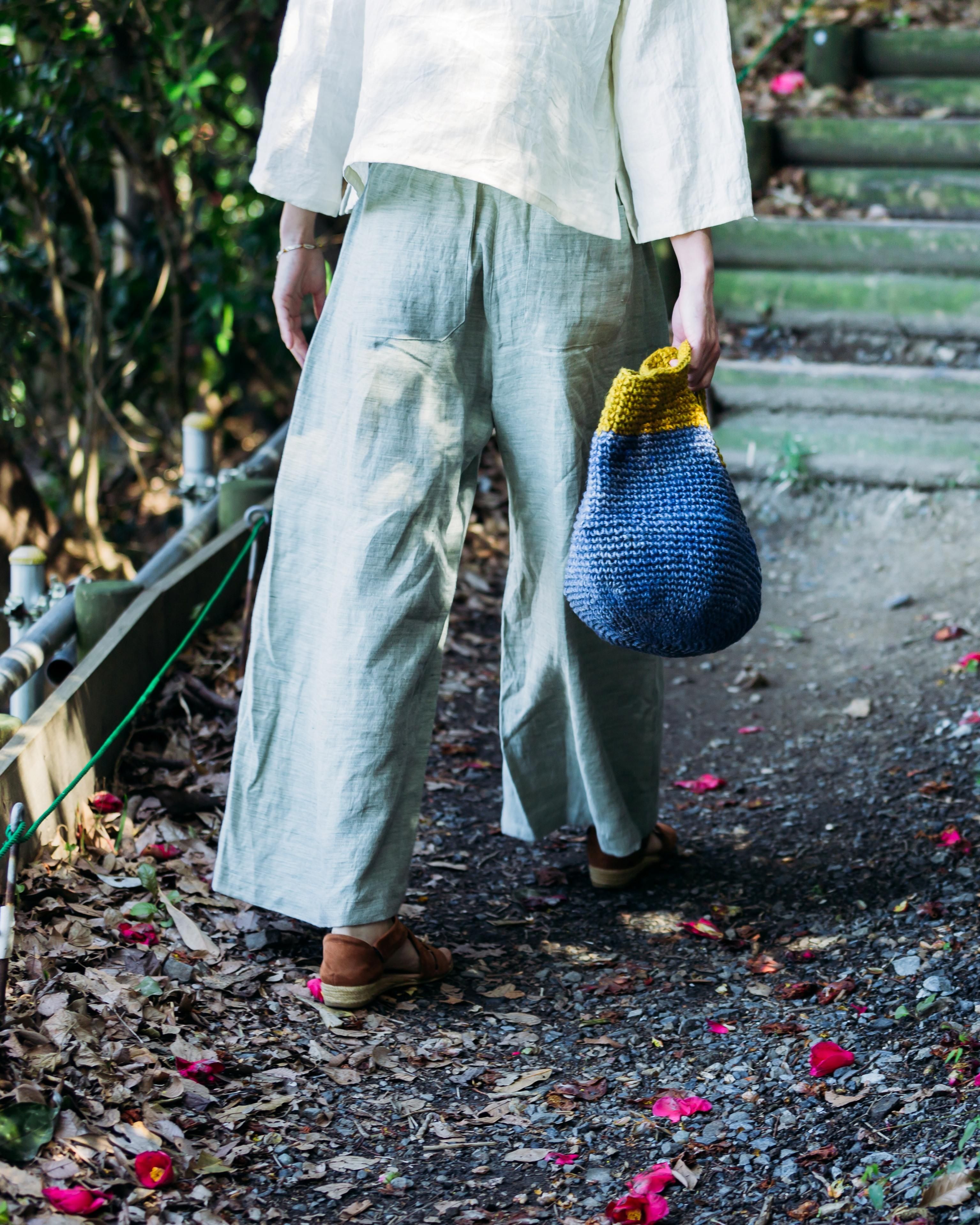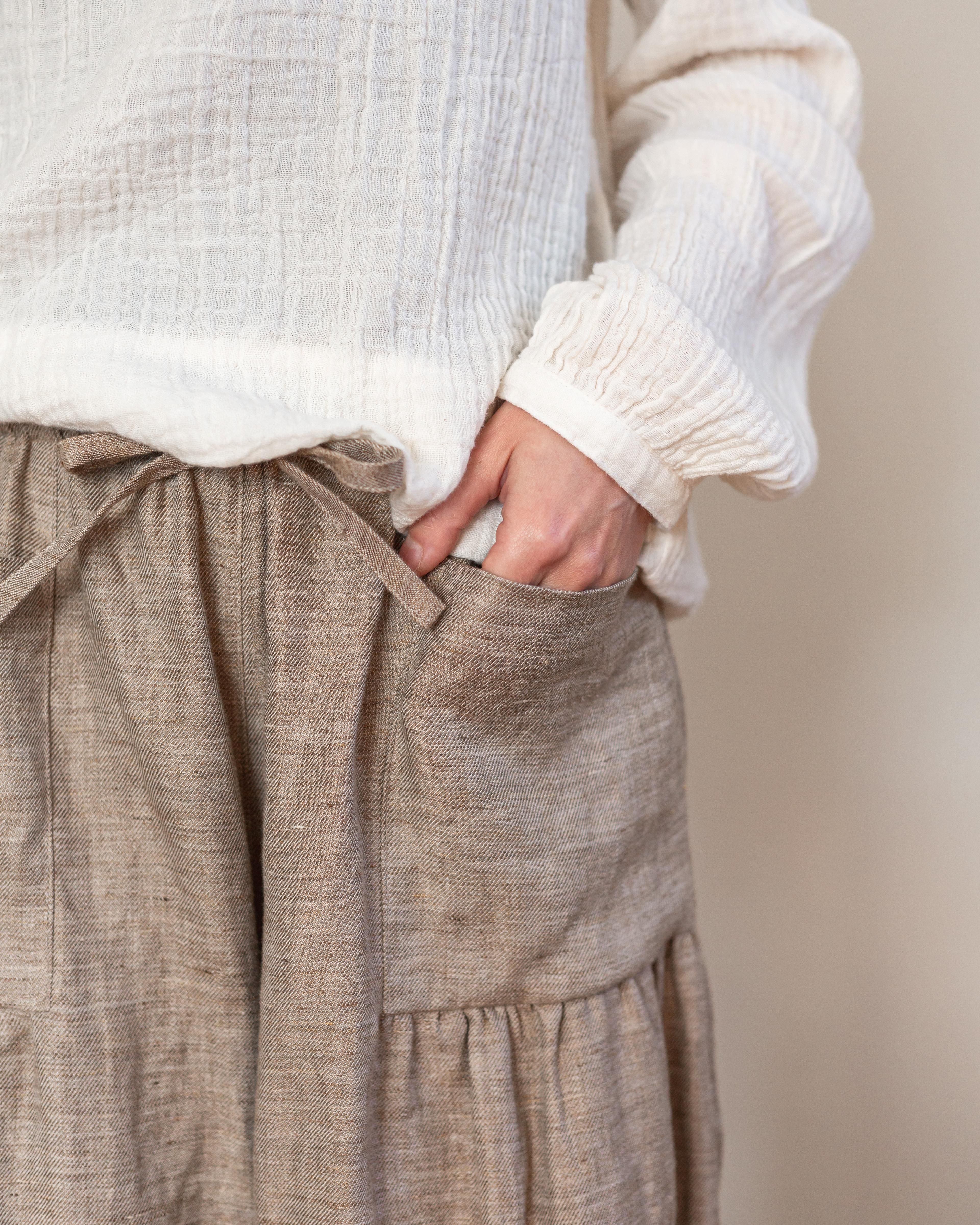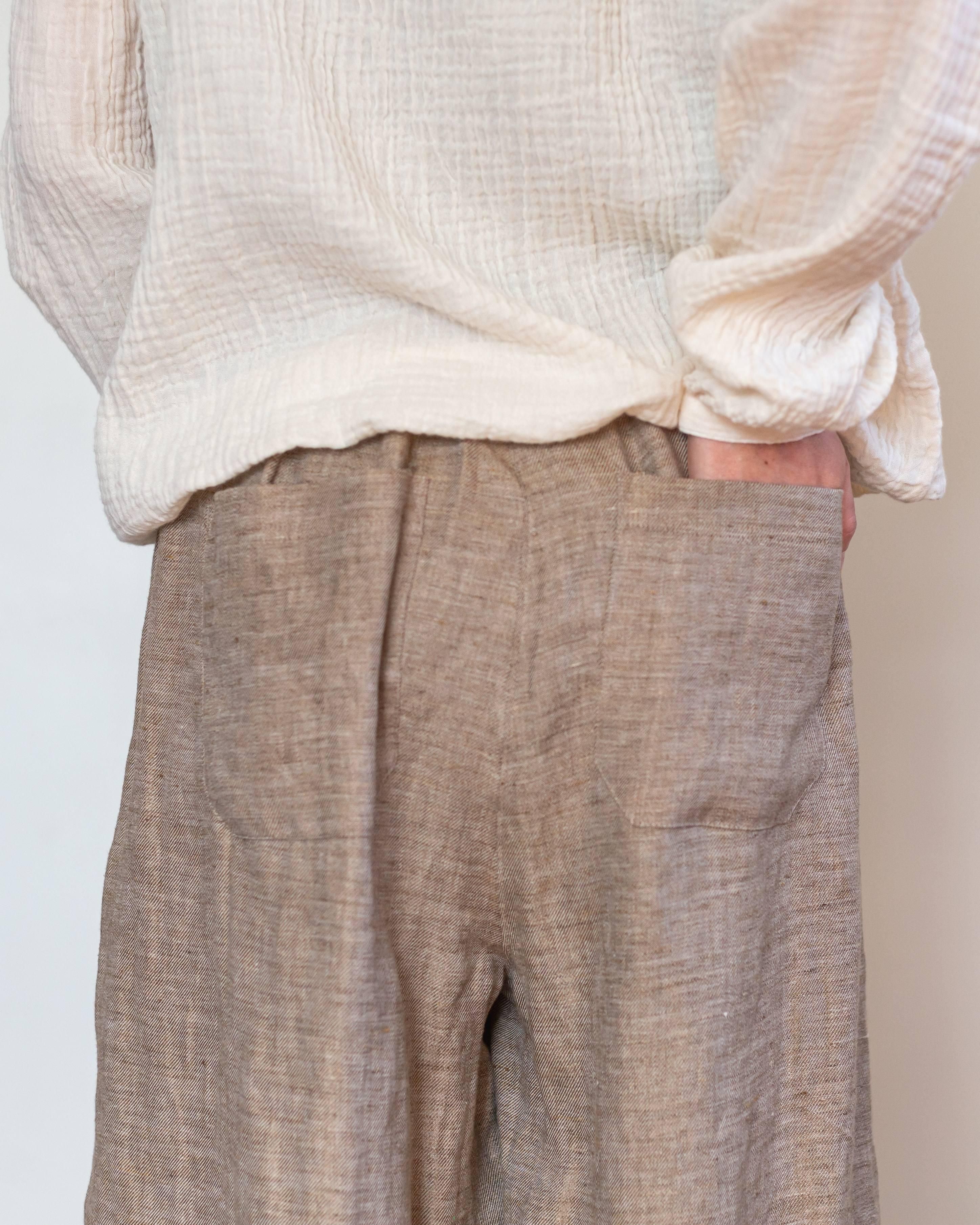 肌触りのいいリネン生地で作った、定番のギャザーワイドパンツです。