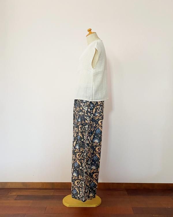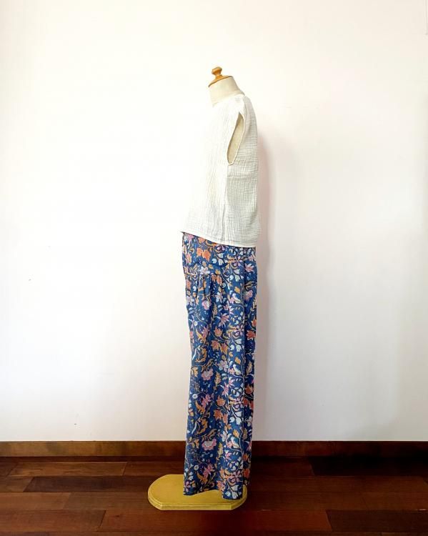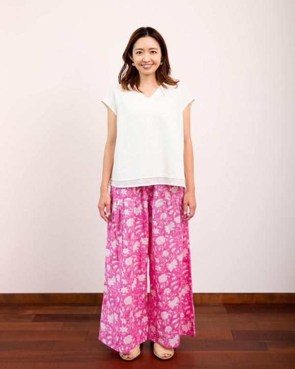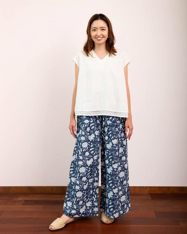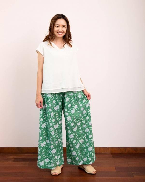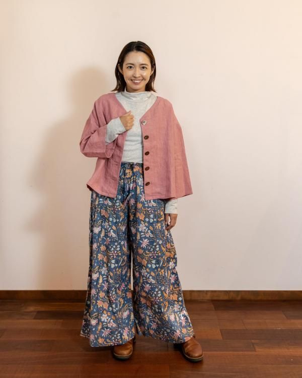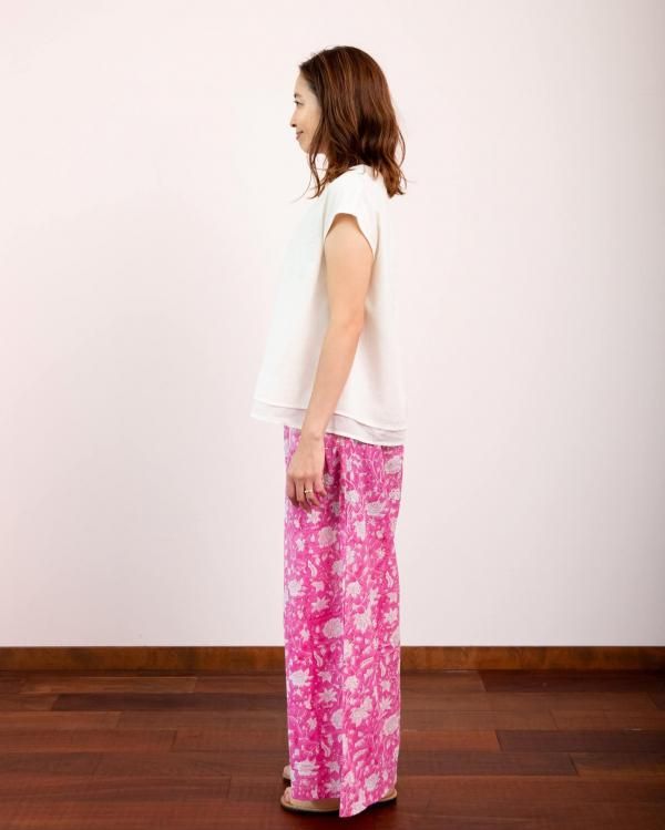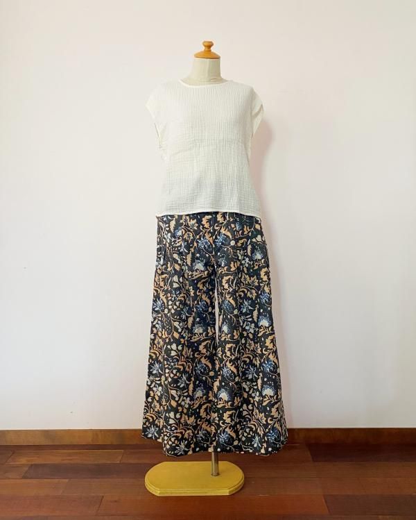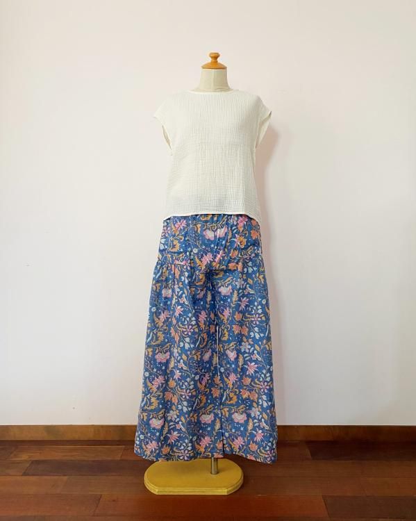 インドの昔から伝わる技法を使用した生地でギャザーワイドパンツを作りました。