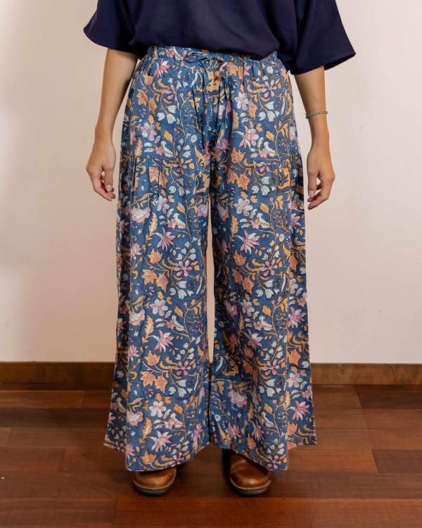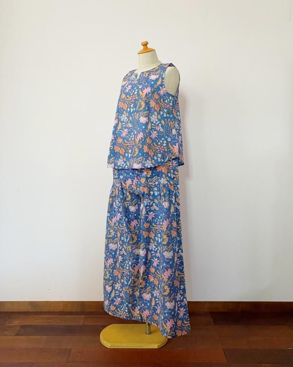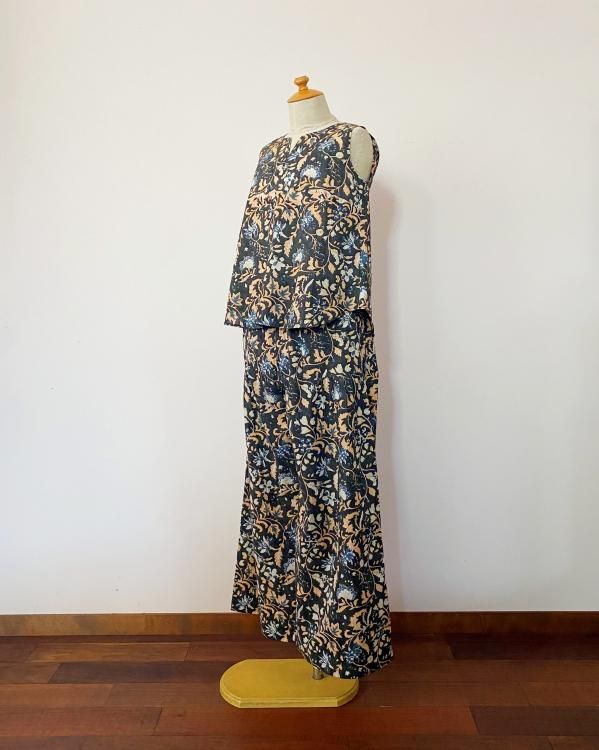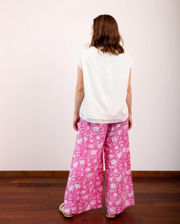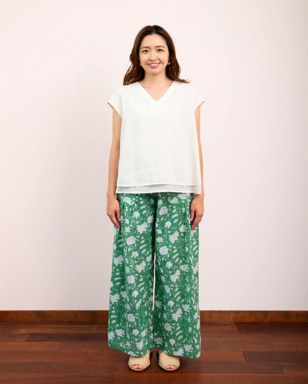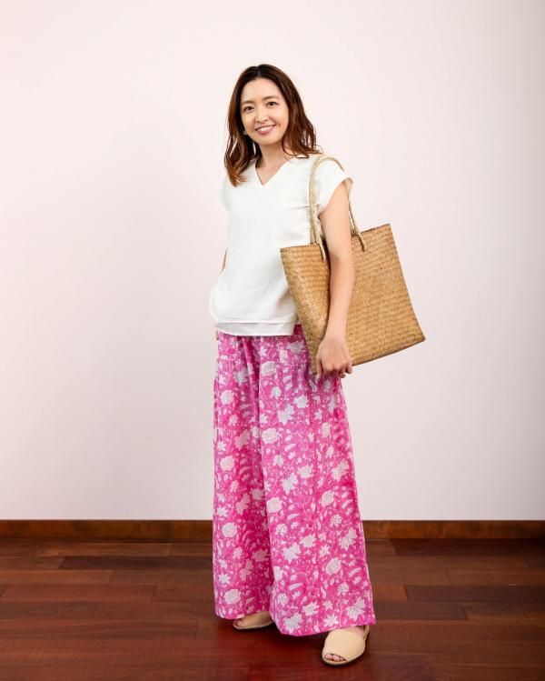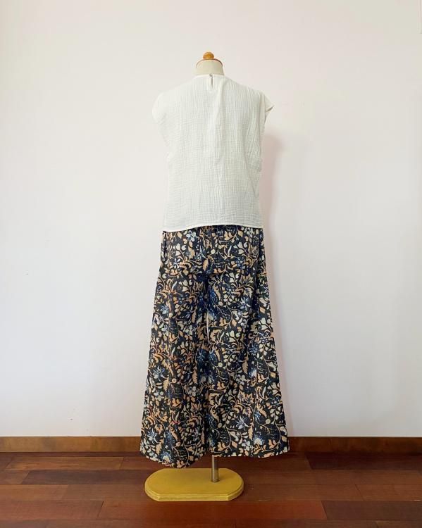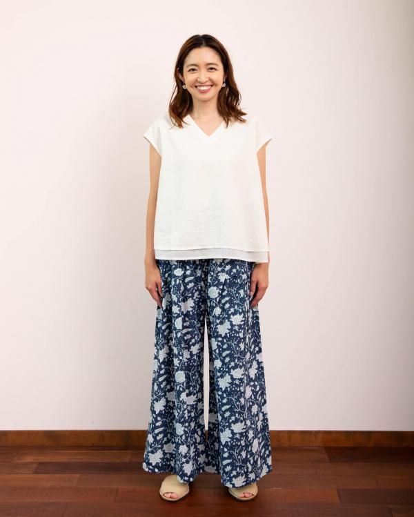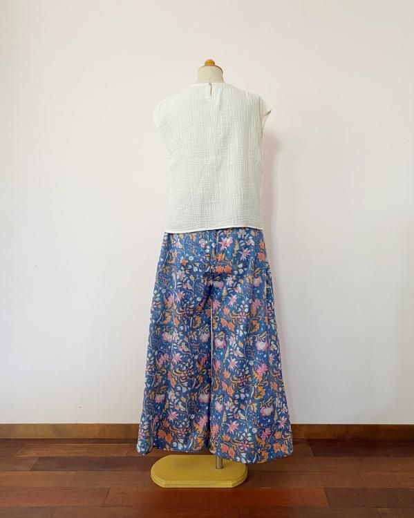 インドの昔から伝わる技法を使用した生地でギャザーワイドパンツを作りました。